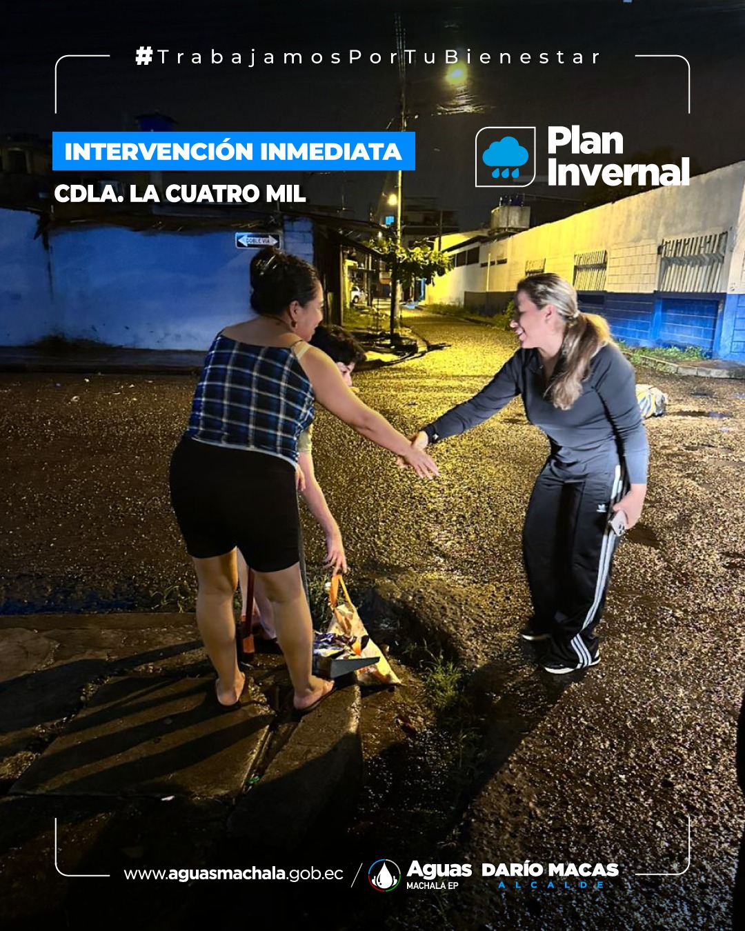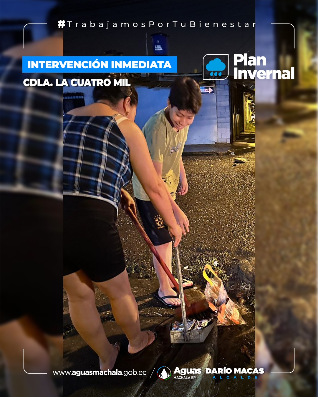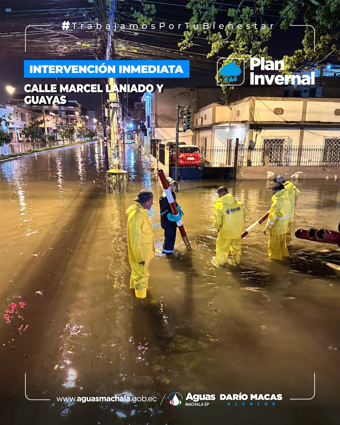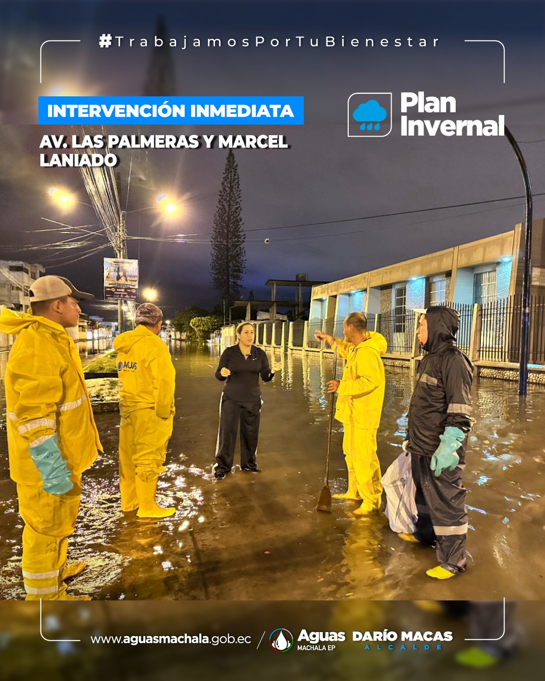 Personal técnico y operativo se encuentra desplegado en las diferentes calles, avenidas y barrios de Machala para actuar de manera eficaz ante la lluvia que cae sobre la ciudad. Nuestro contingente humano está poniendo su mayor esfuerzo para ayudar a que los sistemas puedan evacuar las aguas lluvia de manera rápida.